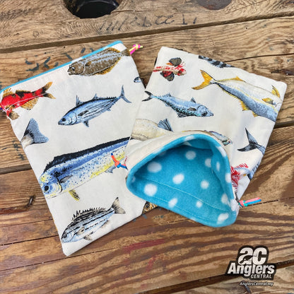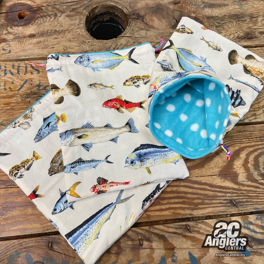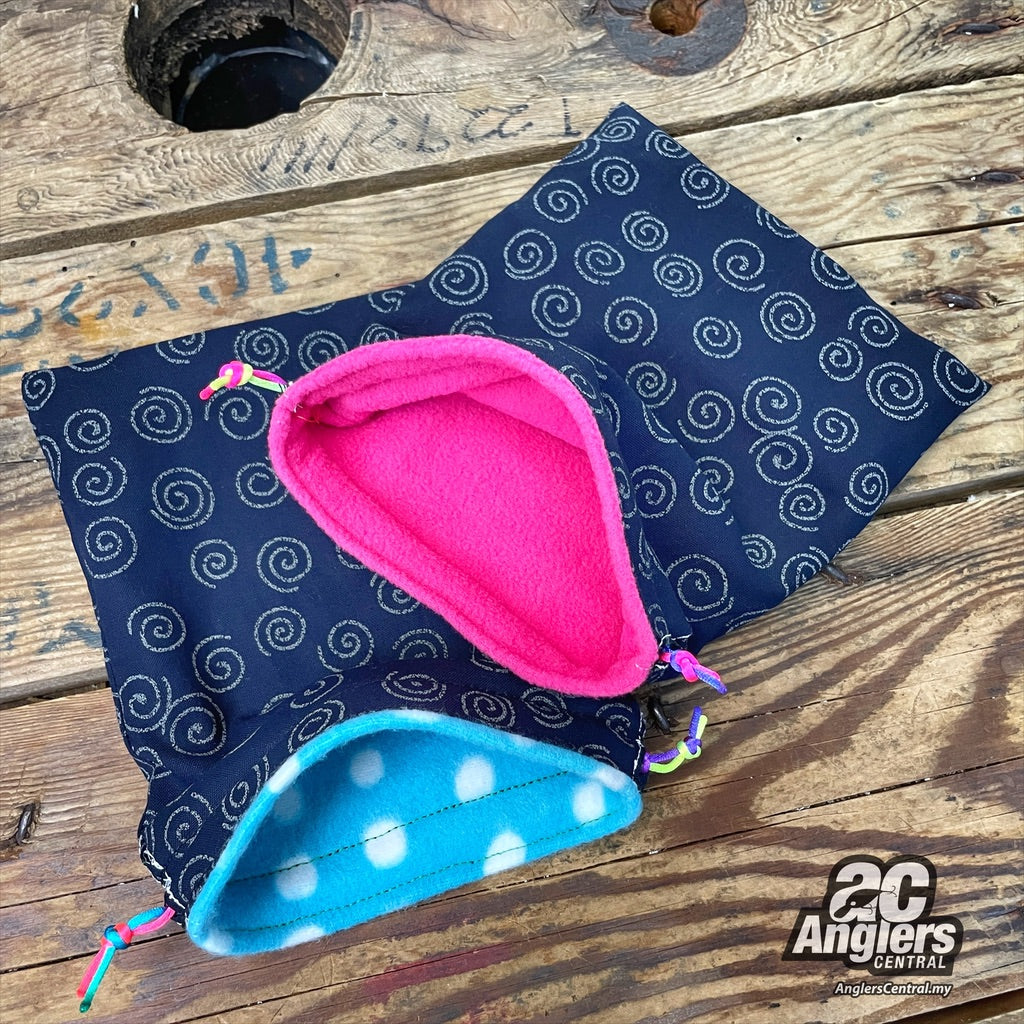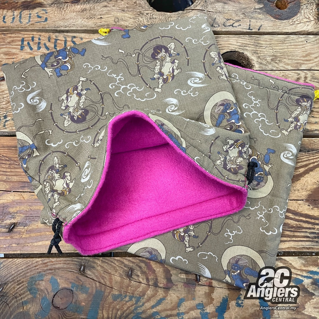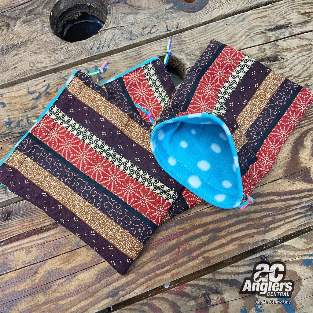 Japanese fabric reel pouches, fleece inner padding.