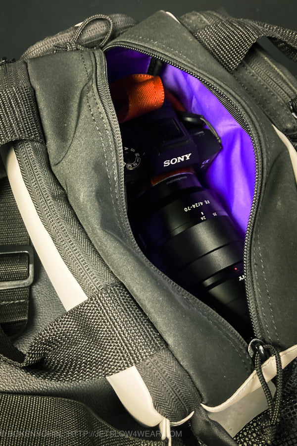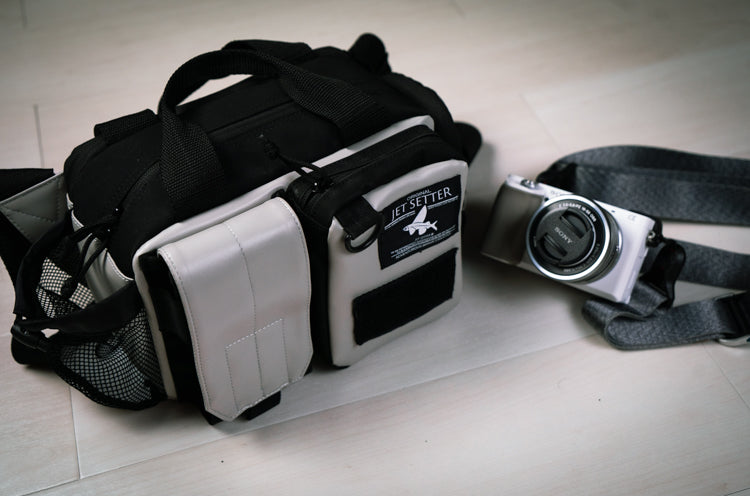 three tackle boxes. A mirrorless camera with a 24-70mm lens attached (α9III + 24-70mm standard zoom). It can easily fit two 500cc water bottles.